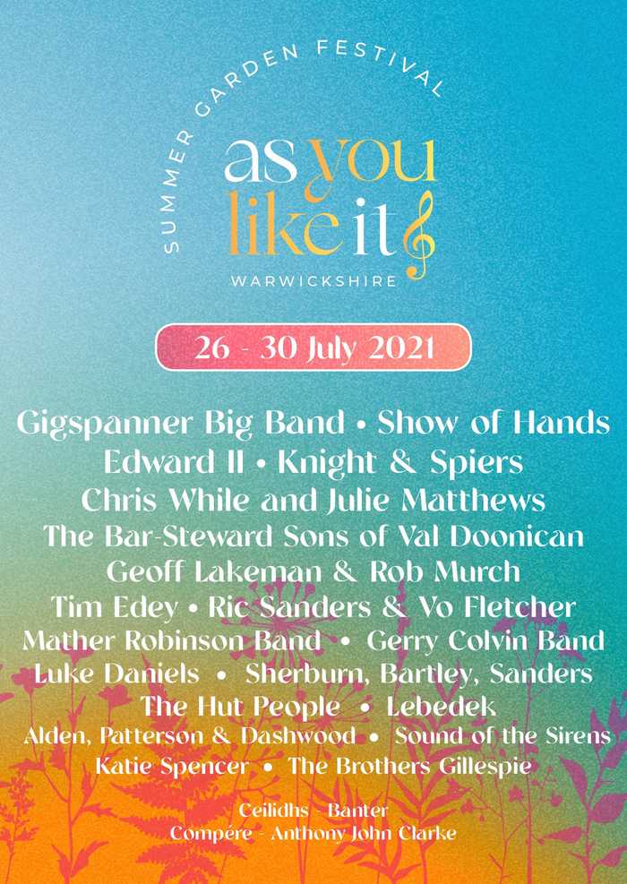 It is with the greatest pleasure that we announce that The Gigspanner Big Band will be headlining at the 'As You Like It' folk festival, hosted by the brilliant Costa Del Folk team. It takes place between the 26th and 29th July 2021 at Walton Hall, situated just outside Stratford upon Avon.